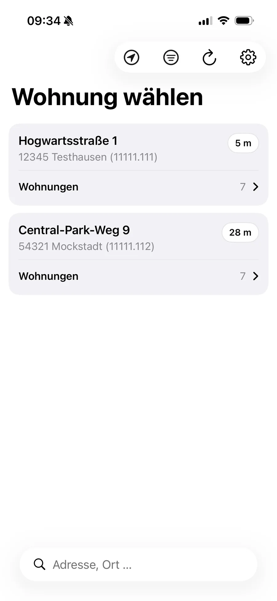 Die App zeigt Gebäude/Wohnungen in der Umgebung und erleichtert die Auswahl vor Ort.